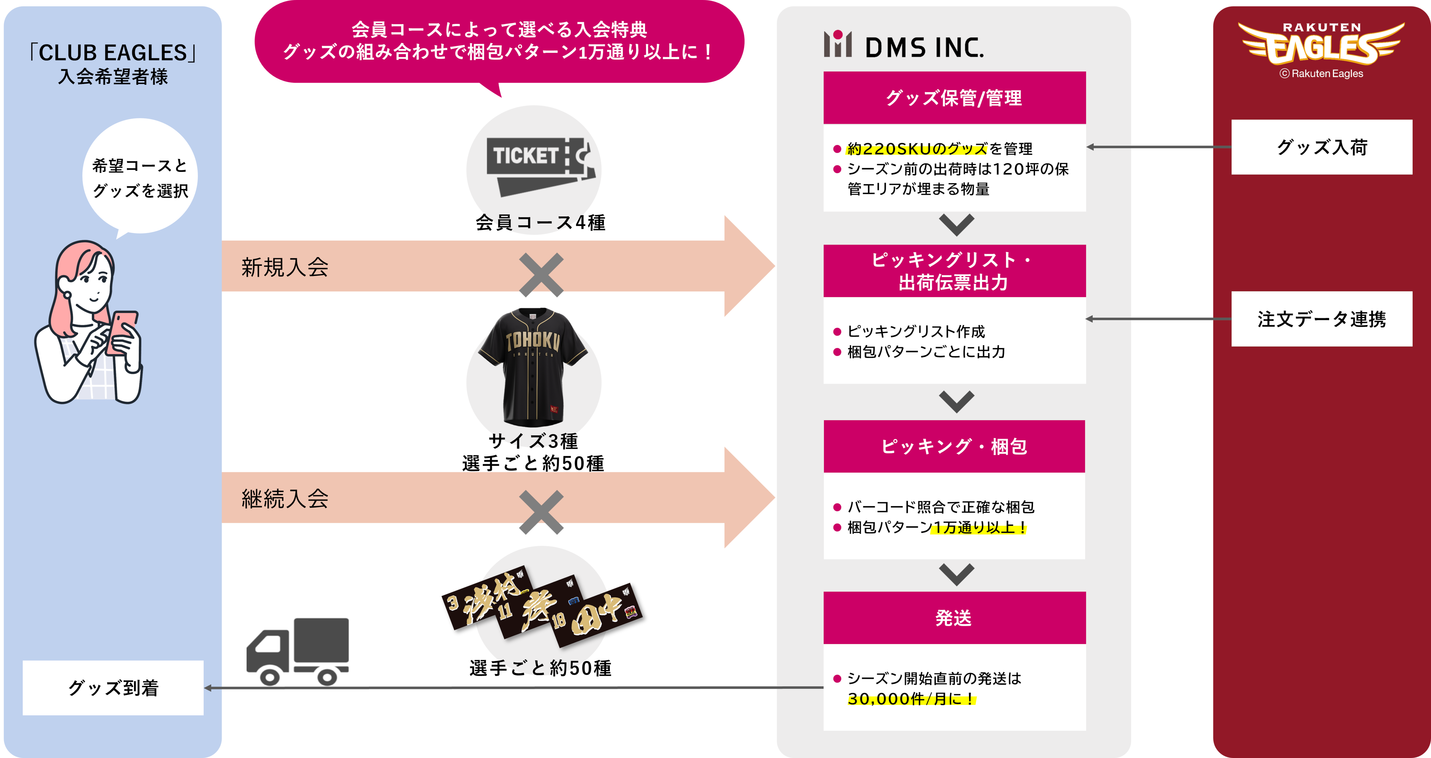 また、会員の方がお気に入り選手のユニフォームやタオルなど欲しいグッズを選ぶことができるため、組み合わせで10,000通り以上の梱包パターンが発生し、梱包作業が煩雑になっているというお悩みを、楽天野球団ご担当者様より弊社の営業宛に頂きました。