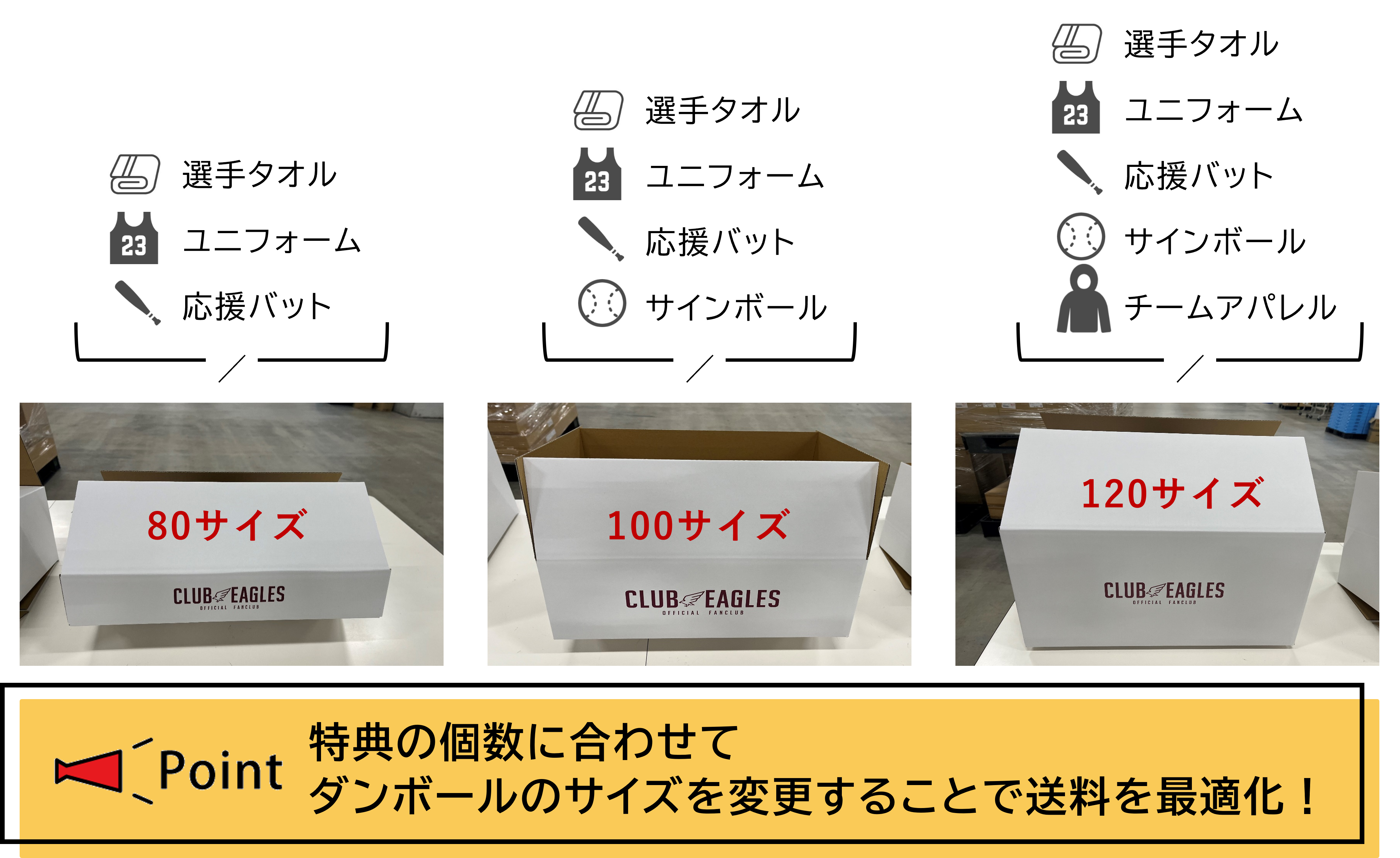 お届けする入会特典がお客様ごとに異なるため、グッズの梱包点数にもバラつきがでますが、お客様全員に同じ箱でお届けするのではなく、梱包点数に応じた梱包資材を3パターン用意し、システムにより自動で最適なダンボールサイズを選び発送をしています。