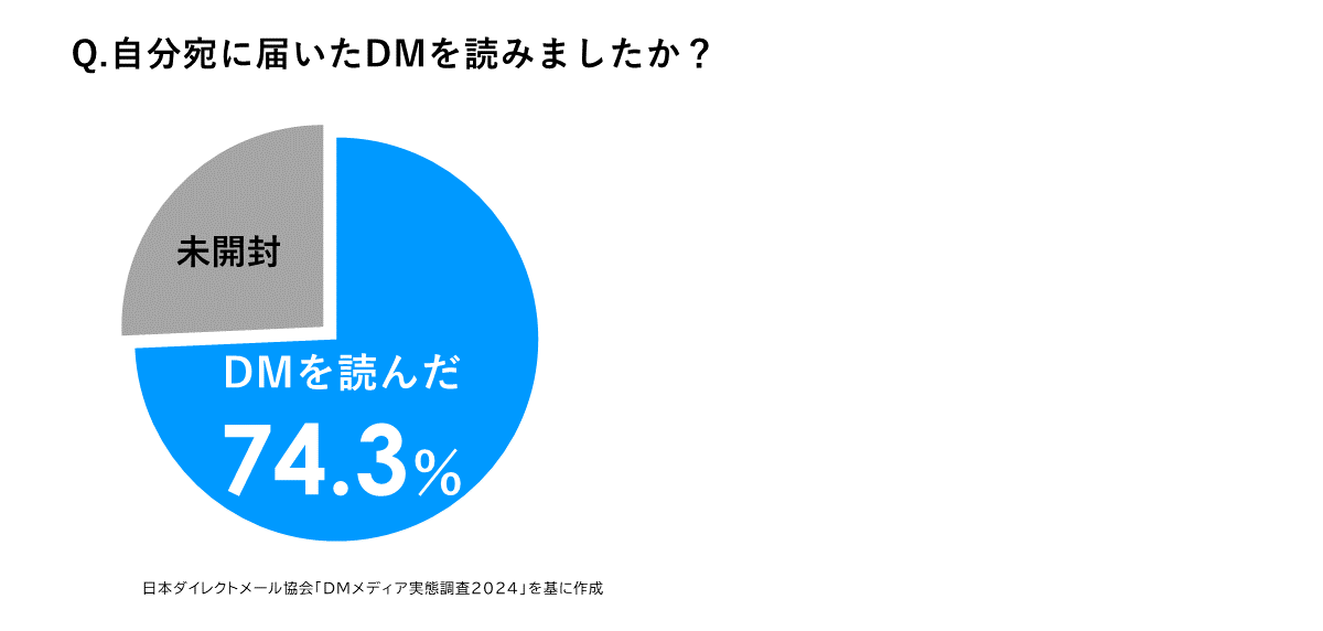 日本ダイレクトメール協会が実施した『DMメディア実態調査2024』によると、DMの開封率は74.3%でした。