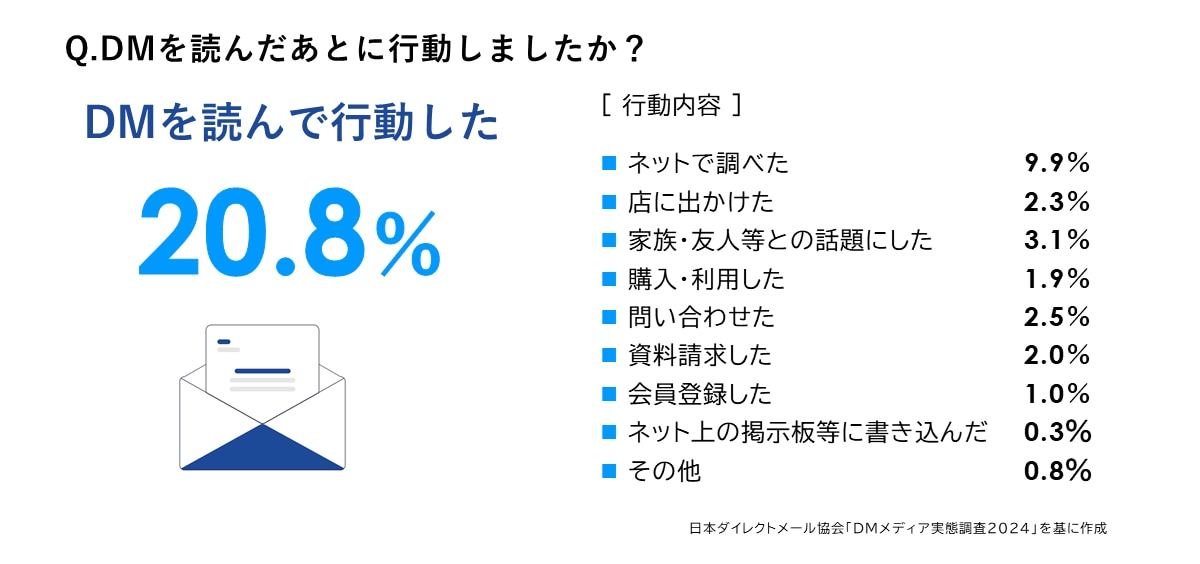 『DMメディア実態調査2024』ではDMを受け取った後に行動したと答えた人は、20.8%でした。