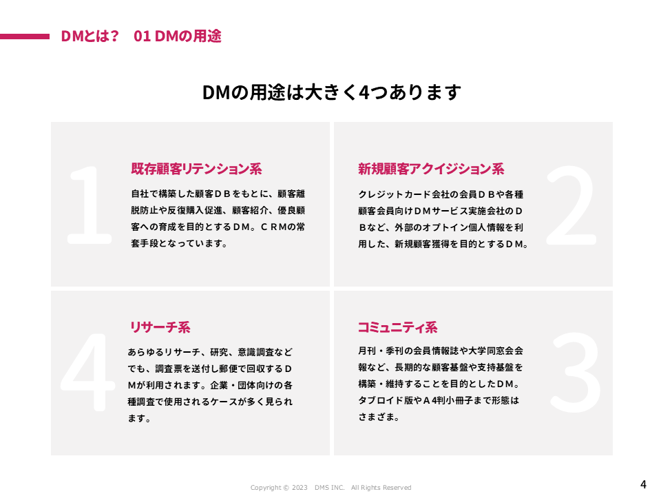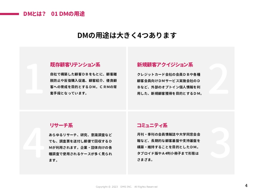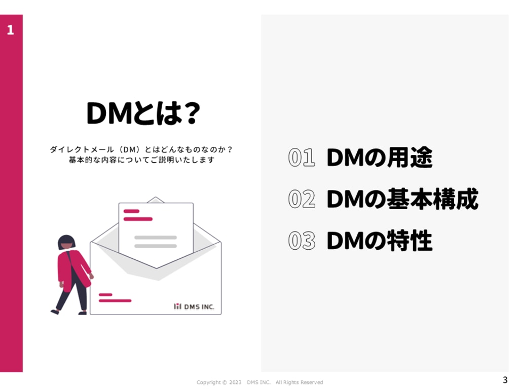 DMの基本から特性・市場動向に加え、DMにつけるオファー・クリエイティブ・ターゲット設定についても解説しています。 このような方におすすめ ● DM発送をしたいけれど、何から始めたらいいか分からない ● DMでのプロモーションに興味がある ● DMのメリットやターゲットの設定方法を知りたい