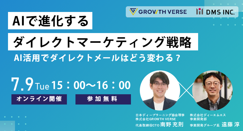 ダイレクトメールのリーディングカンパニーであるディーエムエスと、データ×AIで企業の成長を最大化するGROWTH VERSEは、「AIで進化するダイレクトマーケティング戦略~AI活用でダイレクトメールはどう変わる?~」と題した共催セミナーをオンライン配信にて開催いたします。
