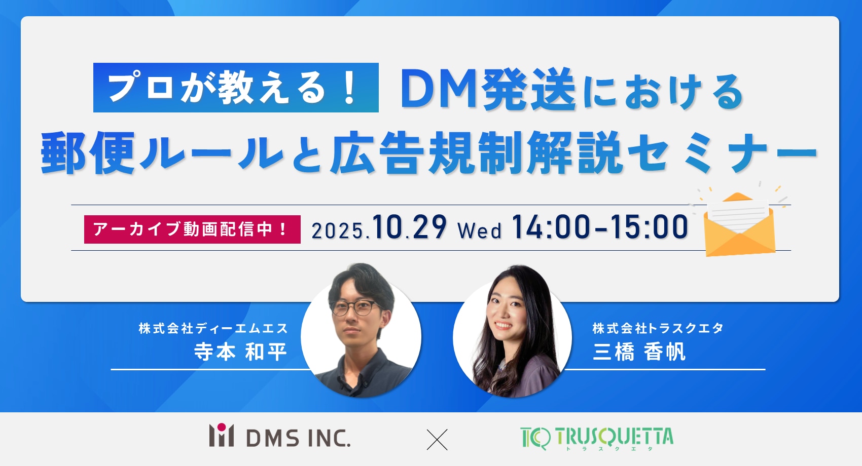 今回のセミナーでは、年間3.5億通以上のDM発送実績を有する株式会社ディーエムエスと、広告表現チェックツールを提供する株式会社トラスクエタが、現場に直結する解決策をご紹介します。