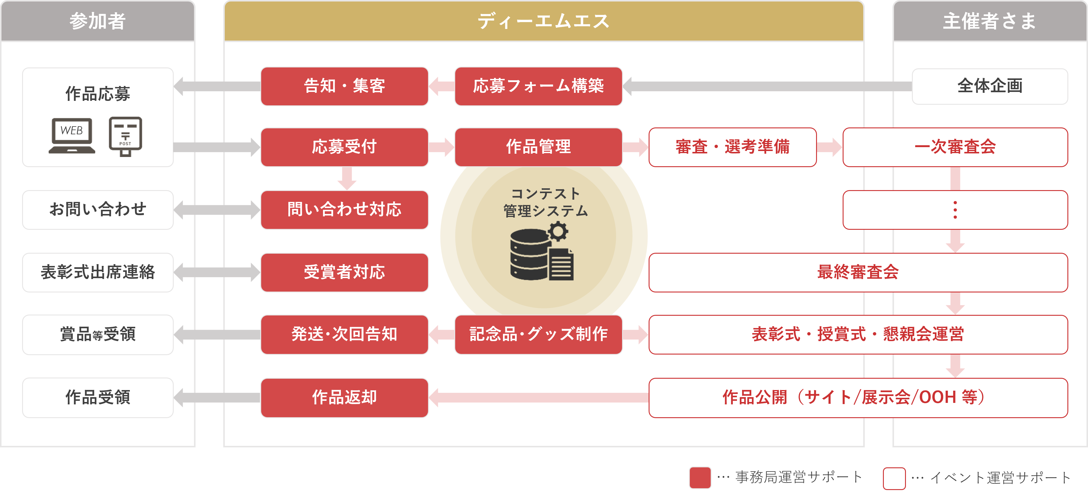 参加者からの問い合わせ対応はもちろん、入賞者や審査員との事務連絡までお任せください。