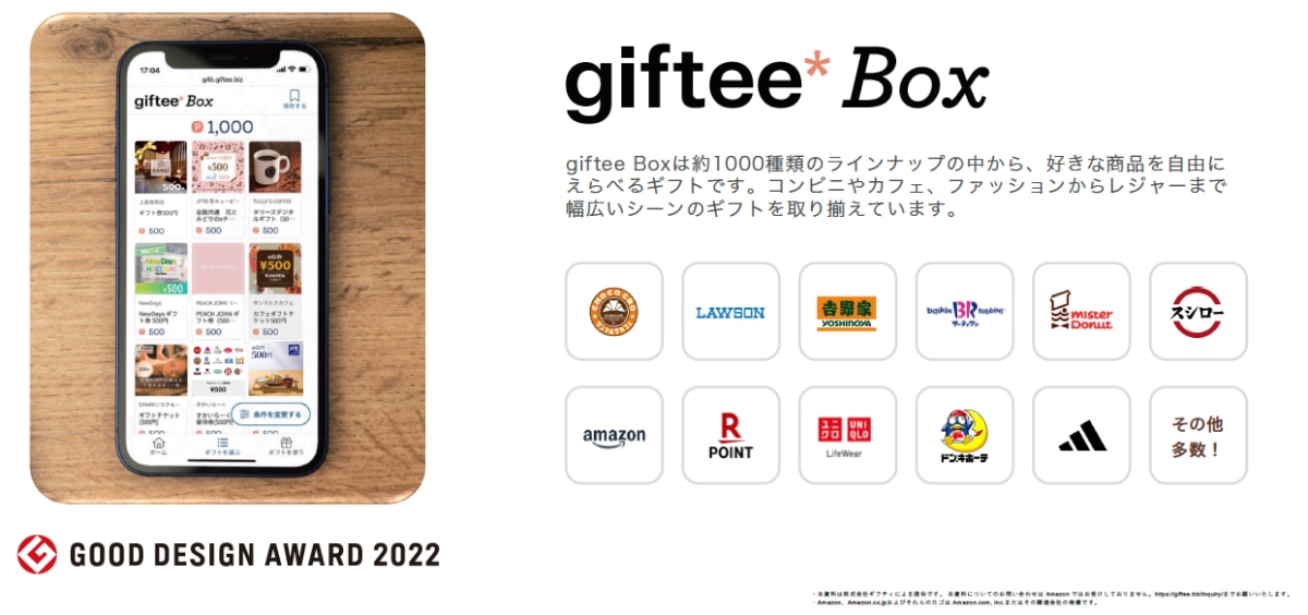 特に「giftee Box®︎」は保有ポイント内で複数のギフトを選ぶことが可能で、その高い利便性から、2022年度グッドデザイン賞を受賞しています。