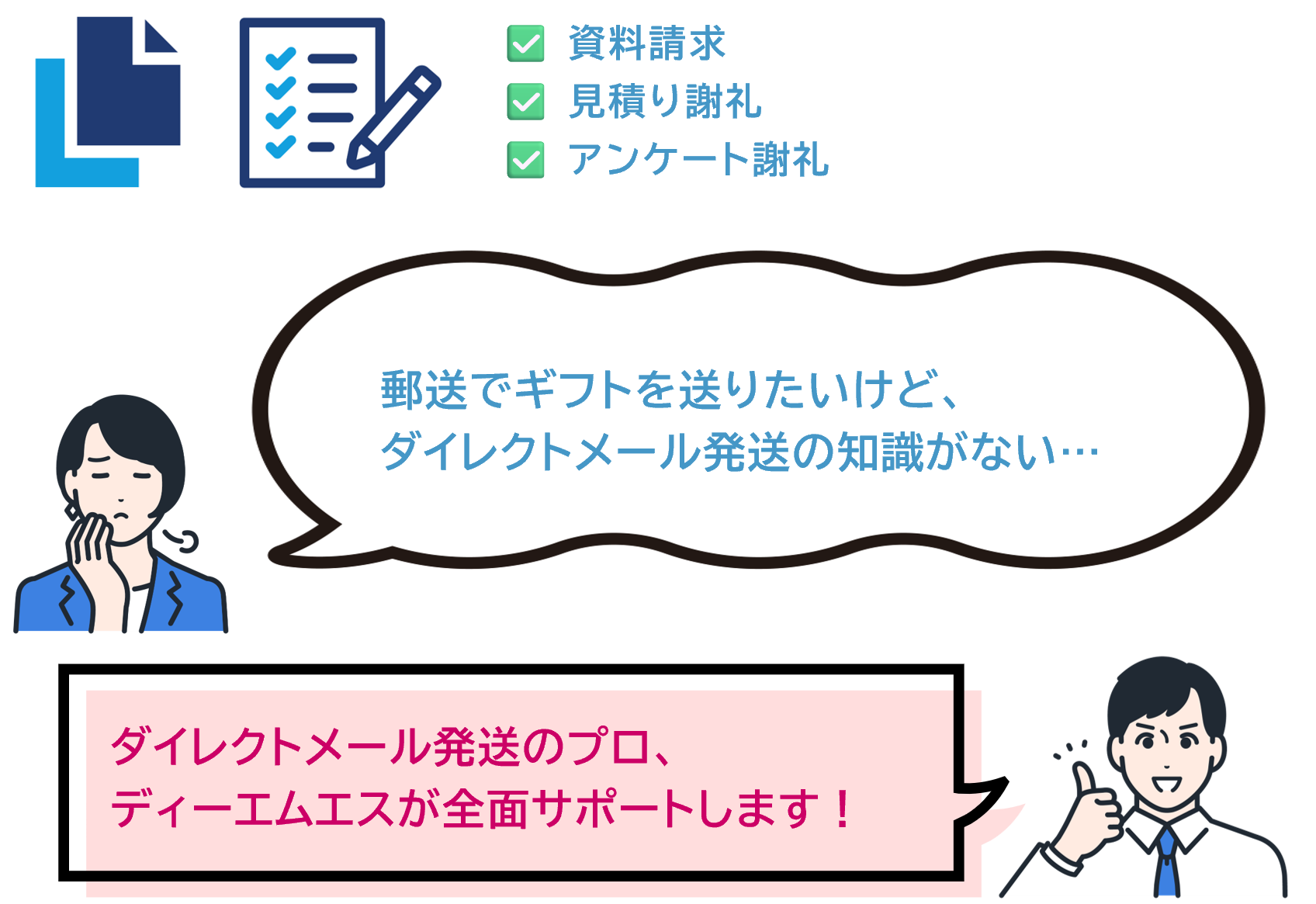 年間3.5億通以上のDMを発送している業界最大手のディーエムエスが最適な配送方法の提案から、ダイレクトメール発送に必要なツールのデザイン・制作、発送まですべて行います!また、業界で初めてPマークを取得し、さまざまな第三者認証を得ているため安心して個人情報をお預けください。