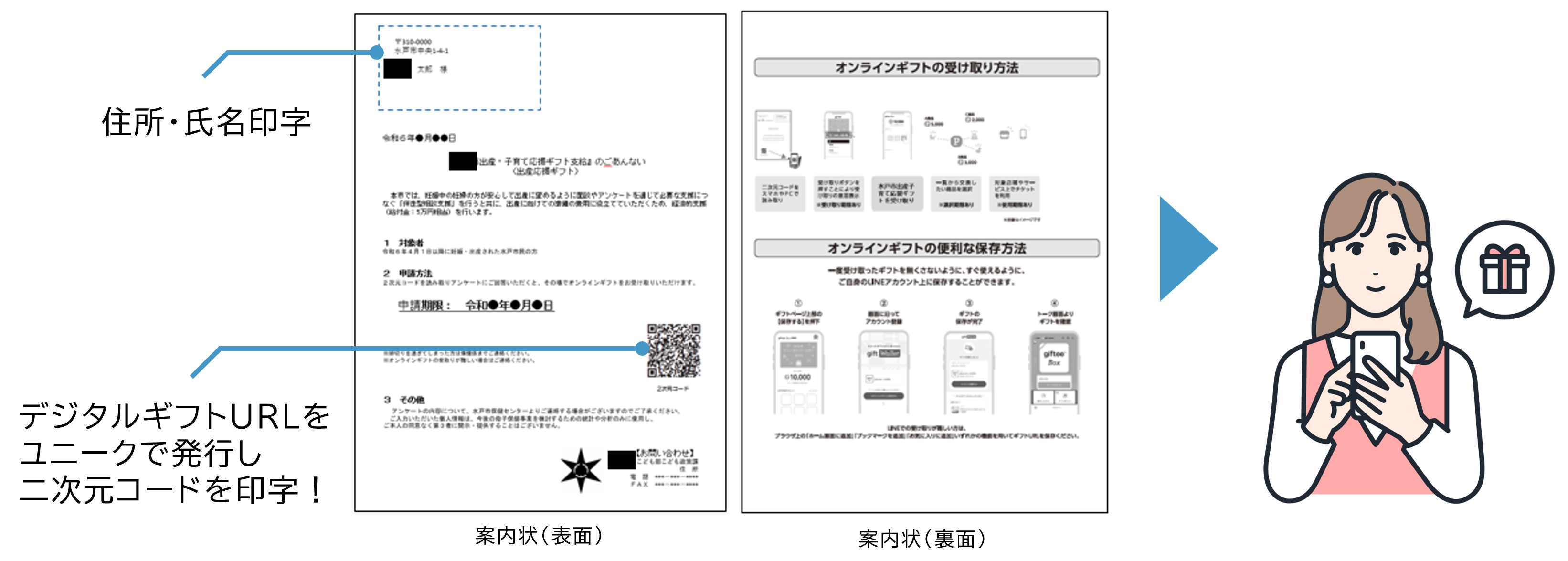 対象者の登録住所にデジタルギフト受取の二次元コードが印字された案内を印刷・印字~封入し、郵送にてギフトを配布