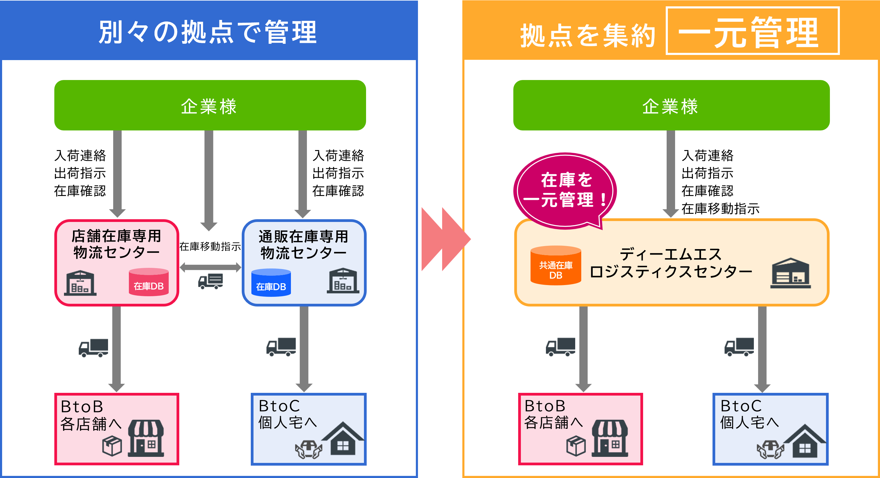店舗在庫と通販在庫を複数の拠点で保管・管理している場合、1つの拠点に集約させ、保管管理を一元で行うことで、業務効率化、コスト削減が図れます。