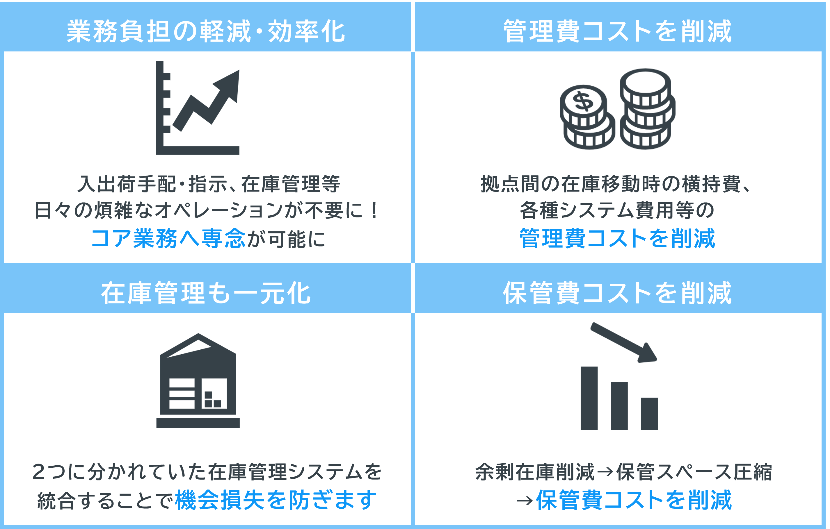 在庫を一元管理することで、コスト(保管費・輸送費等)や在庫のムダを削減し、