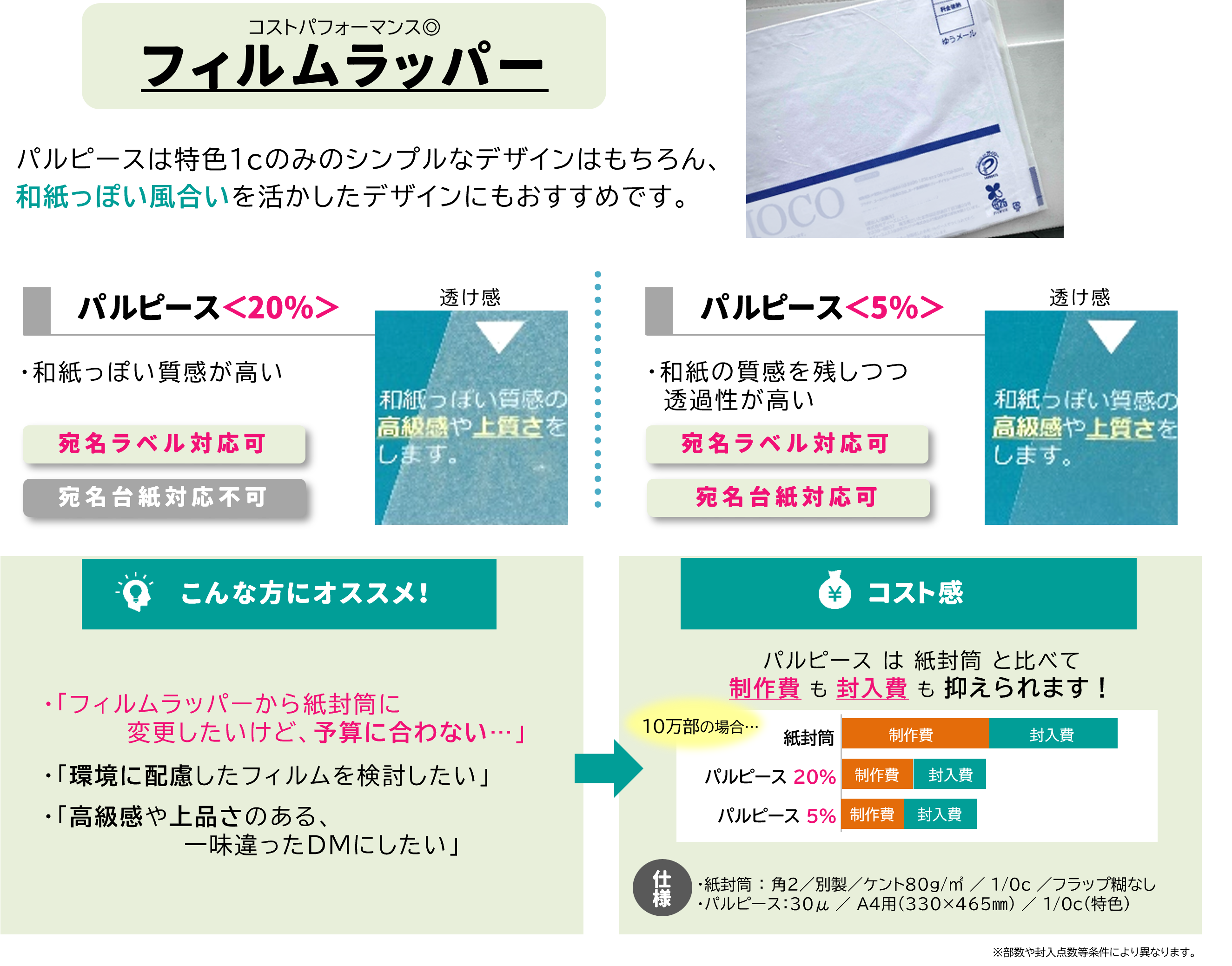 フィルムラッピングDMのフィルムや封筒、手提げ袋等に活用できることから、